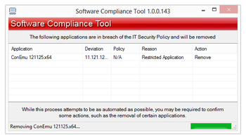 The program runs in the background and monitors the registry for specific keys and if any software on the blacklist policy file is found, Software Compliance Tool attempts to remove it automatically.