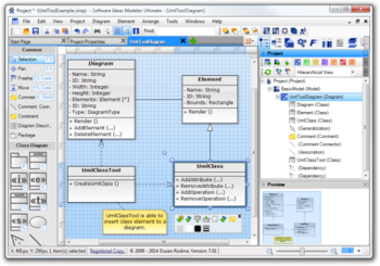 Software Ideas Modeler is a lightweight and powerful tool for the creation of UML diagrams. It supports all14 types of UML diagrams, SysML diagrams, BPMN 2.0, ArchiMate Mixed Diagram, Data Flow Diagram, Entity Relationship Diagram (Crow Foot, Chen, IDEF1X), Requirement Diagram, User Interface modeling, CRC Cards, Behavior Tree, Structure Chart, Roadmap and User Stories. Software Ideas Modeler allows to display the grid and snap to it. It supports various types of automatic alignment for diagram elements. Diagram can be zoomed. There are also implemented standard functions as undo and redo and work with clipboard. Diagram elements can be styled (background color, text color, fonts, border), grouped, placed in layers. The application supports also style sets for the whole project. The diagrams can be exported to multiple image formats vector formats WMF, EMF, SVG and bitmap format PNG. The tool supports source code generation (C#, C++, Delphi/Object Pascal, Java, JavaScript, VB.NET, PHP, Ruby, SQL DDL, TypeScript), source code parsing (C#, C++, VB.NET, Java, Object Pascal, PHP).