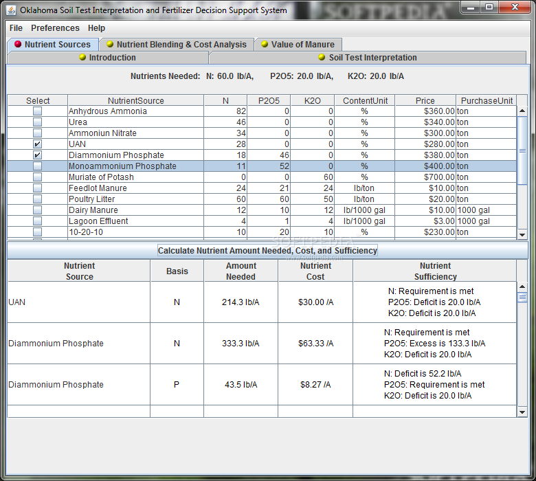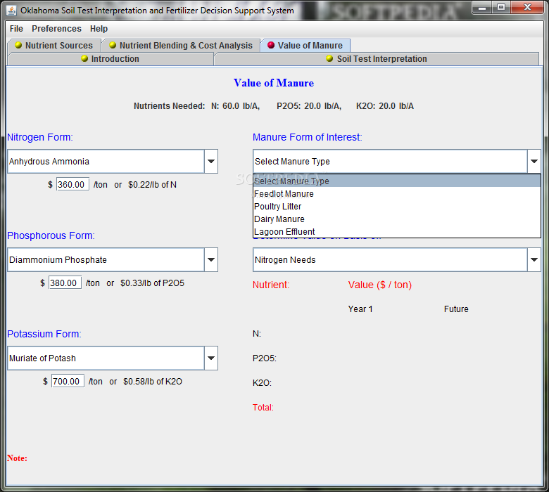 Soil Test Interpretation and Fertilizer Decision Support can also serve to provide fertilizer rates to meet the crop nutrient needs. Anothe use may be to calculate the value of animal manure as a nutrient source for specific field conditions.System requirements128 MB or more RAM