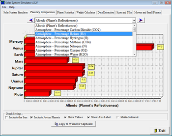 It has a tool that allows you to company 42 planetary graphs, including Atmosphere - Percentage Nitrogen (N), Atmosphere - Percentage Oxygen (O2), Atmosphere - Percentage Water (H2O) and many more.