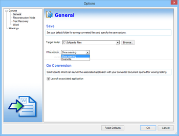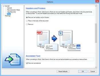 In terms of output preferences, the program can export the files to RTF or DOCX format, having a series of adjustable options at your disposal. This way, you can select the ‘Reconstruction Mode’ (flowing, continuous or exact) as well as decide how to deal with headers and footers, annotated text and tables.