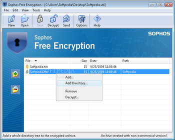 Sophos Free Encryption creates password-protected encrypted archives so you can share confidential data quickly and easily. Create or extract a secure archive simply by a right clicking on a file in Windows Explorer.