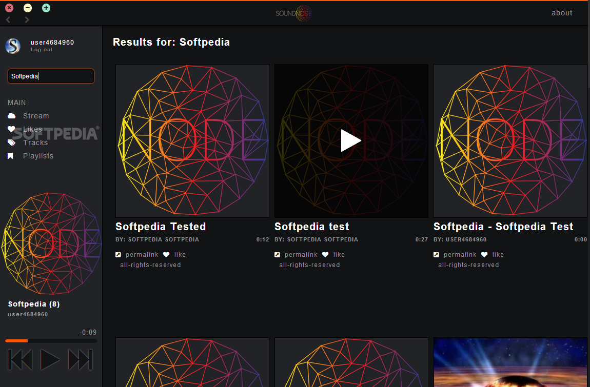 Each song in your SoundCloud library is displayed in the 'Stream' section, with additional options for assigning it a 'like' or opening the 'permalink' in the default web browser. and if you have a large collection and find it difficult to find a specific song, the integrated 'search' function can help you out.
