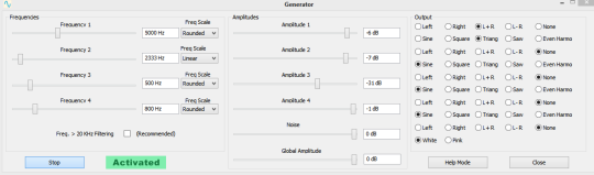 Spect&Gen is an audio measurement environment which combines an audio Spectrum Analyzer, four audio Wave Generators (sine, square, triangular and saw-tooth waves), a white or pink Noise Generator and an Osciloscope .The purpose of Spect&Gen is to perform Audio measurements on audio amplifiers and players: distortion, signal to noise ratio, bandwidth... . The display is very precise with a dynamic range of 130 dB (when the hardware allows such a precision). The output of the signal generator can also be recorded in a "WAV" file that can be transferred to a USB key or a CD for testing the quality of a CD or a DVD player.