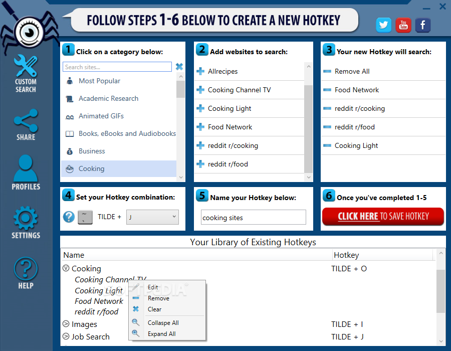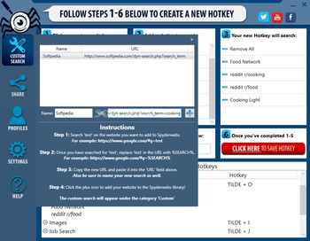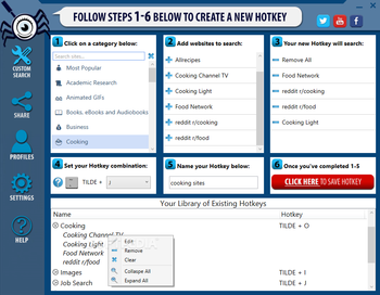 After a quick installation, you come face to face with a user-friendly interface that features clear instructions on how to use the application. Therefore, you can create a new hotkey for searches following six simple steps, namely selecting the category, websites to search, specifying the content to look for, configuring, naming and saving the hotkey.