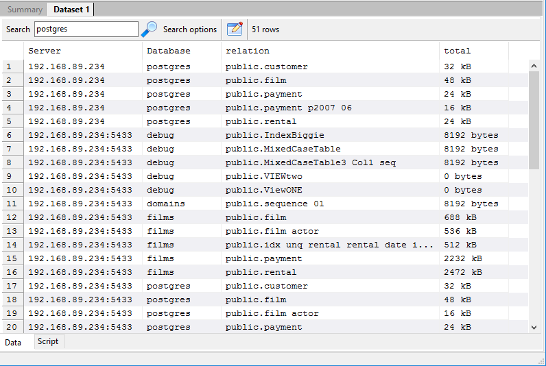 Do you manage multiple servers for multiple purposes in your work? Do you want to be able to run sets of scripts on multiple server concurrently, from a single application? Wouldnt it be nice to be able to view the results of the scripts from your servers in a single consolidated result set, instead of individual result sets for each server?Then give SQL Multi Select a try. It does all the above and more, to make your job of managing your servers easier.You can set up multiple lists of servers for different purposes. For e.g. you may have different server lists for test, production, or QA. Data retrieved from multiple servers are displayed in a consolidated result set. The origin of the data is also displayed, so you can quickly tell from which server and database the data was retrieved from.Need to share your consolidated result sets? SQL Multi Select can export your result sets to text files and even into a SQLite database. Need to compress those files? Thats taken care off too, with zip and 7-zip compression options.Use regular expression filters to include or exclude databases from your projects. With this, any new databases that meet the filter criteria are automatically included (or excluded) from your project.You can quickly exclude scripts or servers from your project run simply by unchecking the appropriate item. Very convenient if you want to test a single script, or run scripts on a particular set of servers.You can quickly exclude the results from one or more servers from the result sets simply by unchecking the appropriate servers.Easily set up and run daily maintenance and health check scripts so that you have a record of your databases settings and statistics, using the SQL Multi Script command-line interface.You can configure the number of server and database threads in your projects. This allows you to run your scripts on multiple servers in parallel, meaning results are returned faster.SQL Multi Select can run scripts on MySQL, Oracle, or PostgreSQL query groups. Thats almost like having 3 products for the price of one.