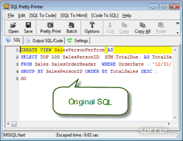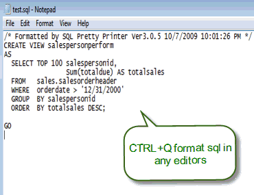 SQL Pretty printer is a tool to beautify sql code in any editors with a hotkey,make it more readable. Support Query Analyzer, SQL Server Management Studio(SSMS),VS2003/2005,Toad and common editors such as UltraEdit. Besides beautify the SQL, it can also translate the SQL into C#,Java,Php and other program languages that is ready to use in your program.