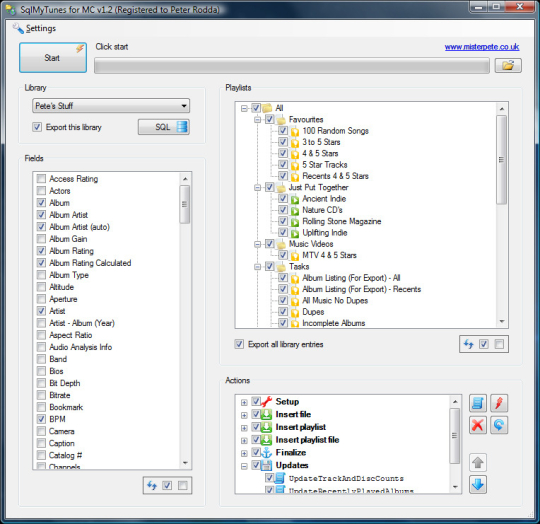 SqlMyTunes will export your J River Media Center library to SQL and allow you to create playlists and smart playlists automatically, as well as perform updates, using stored procedures. Examples include auto-updating Total Disc # and Total Track # counts or creating an Album Last Played field, or you may want to create a smartlist for every artist that has more than five tracks that have been rated over three-stars. Anything is possible! Currently SqlMyTunes for MC supports Microsoft SQL Server and Microsoft SQL Express.
