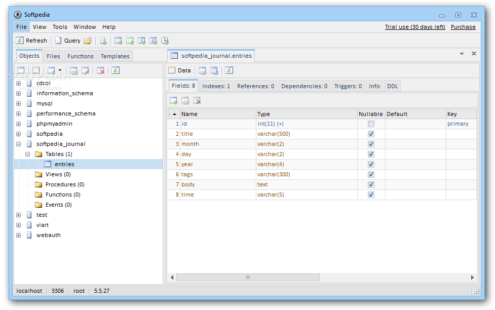 SQLWave is a tool for MySQL Database Server designed to automate and simplify database development process. It also provides an easier way to explore and maintain existing databases, design compound SQL statements, query and manipulate data in different ways. Intuitive GUI interface for all MySQL operations. Very fast retrieval of data. Manage foreign key relationships. Syntax-highlighting and Intellisense. Fully MySQL 4.x-6.x compliant. Manage stored procedures, functions, triggers, views, and event.