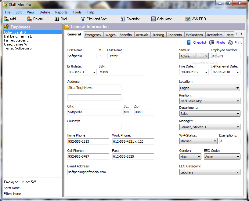 Staff Files has over 30 reports that correspond to personnel records already entered in the program. Print professional reports for individual employees, or a full staff report. Employee checklist and evaluation templates make it easy to record and collect the information you need. Preview reports by department, location, position, seniority, or by any group of employees. Save, print or e-mail any of the reports and templates with just one click. You can also convert documents to PDF or RTF files for easy electronic storage and distribution.