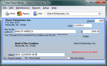 Star Check Writer is a simple yet powerful application program used to make the process of printing your checks fast and easy. It prints on your own personal checks. Stop hand writing your checks, you have a computer and printer, use them. This program does not print your actual check; it fills in what you already have. There is no risk or costs involved with trying it out. So download and try it out today. There are many features that simplify the whole process of printing personal checks. There is a fully functional database that stores youre Payees, and many more sets of data. It is probably one of the easiest Personal Check Printing pieces of software on the market today.