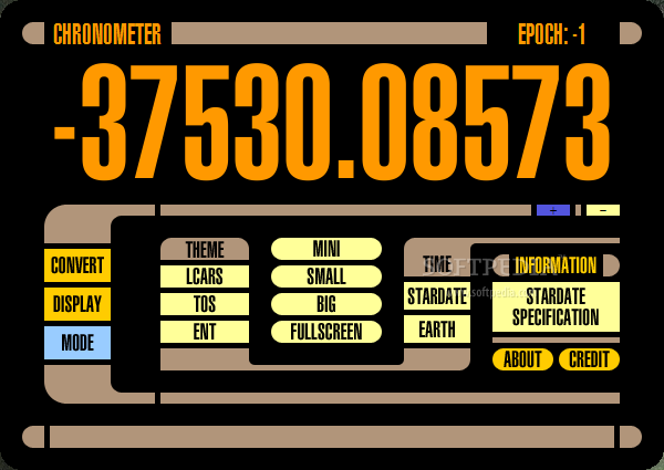 It has four different window sizes, so the user can switch between Mini, Small, Big and Fullscreen displays. It can be used to convert Stardate time to Earth time, and back.