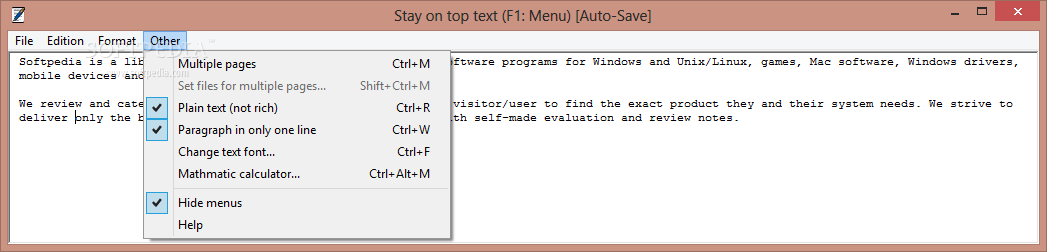 All in all, Stay on top text is a simple and useful software solution for writing and creating documents, it comes with some handy features like automatic saving and text formatting. However, it doesn't have the option to print your documents.