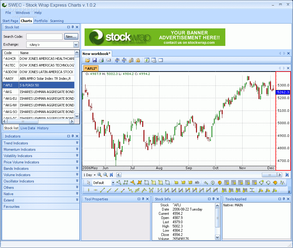 StockWrap Express Charts is a free stock and analysis software with 100 indicators & tools and 50,000 stock codes, covering almost every exchange on the planet. It also has free live data updates, portfolio manager and scanning manager.