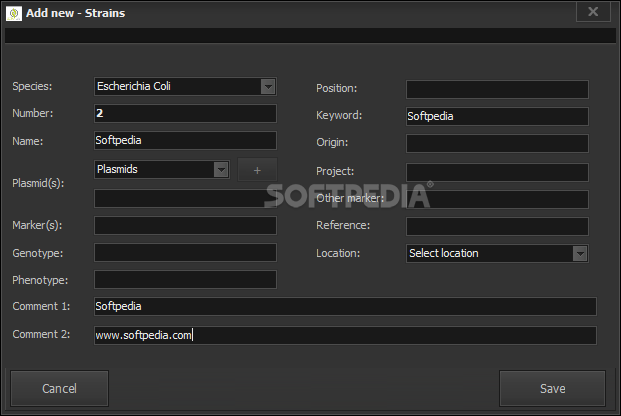 To extend the selection of chemicals in your database, the utility enables you to add new items to the inventory. The addition window offers you the possibility to choose the strain species and its location, as well as manually enter the name, markers, keywords and comments for every particular strain you add. In addition, you can also import them from your computer and create a copy of the entire database for backup purposes.