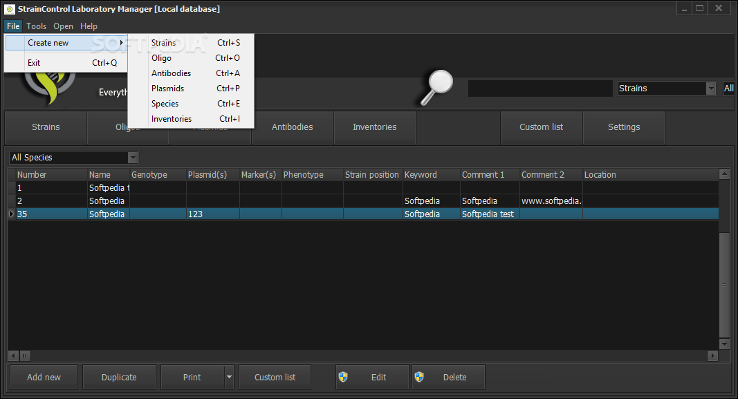 StrainControl Laboratory Manager is an application that enables you to keep track of a wide variety of chemicals and compounds for your laboratory, such as strains, oligos, plasmids or antibodies, which can be stored in a database for increased accessibility. These items are organized in lists and they contain additional parameters and information about their type and attributes.