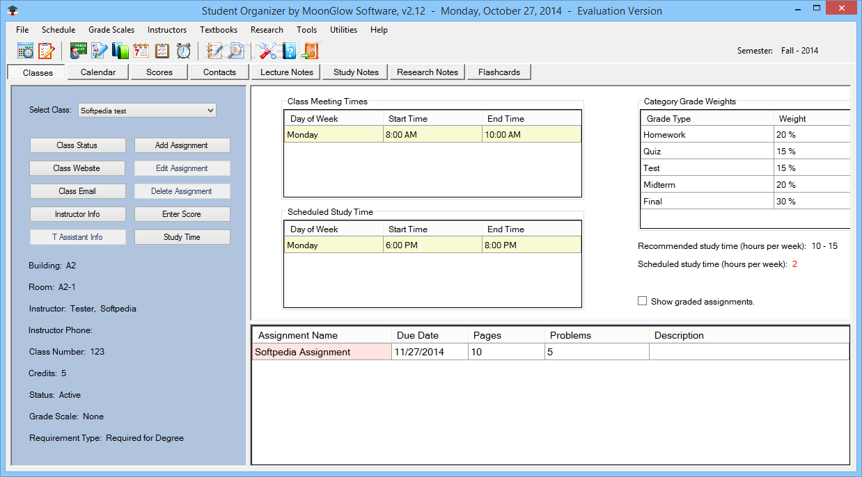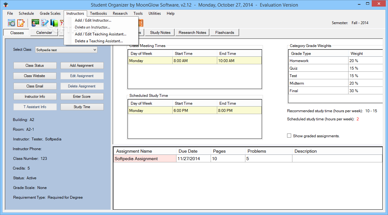 For starters, you will need to fill in the required information for Student Organizer to be able to deliver the results you are after. As such, you can begin inputting the school semesters, the classes you will be taking and their type ( for instance ‘Required For Degree’, ‘Audit / No Credit’ or ‘Elective For Degree’), the instructors' names, the meeting times along with the rooms and buildings they take place in, as well as the grade weights.