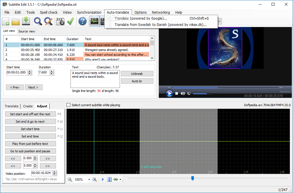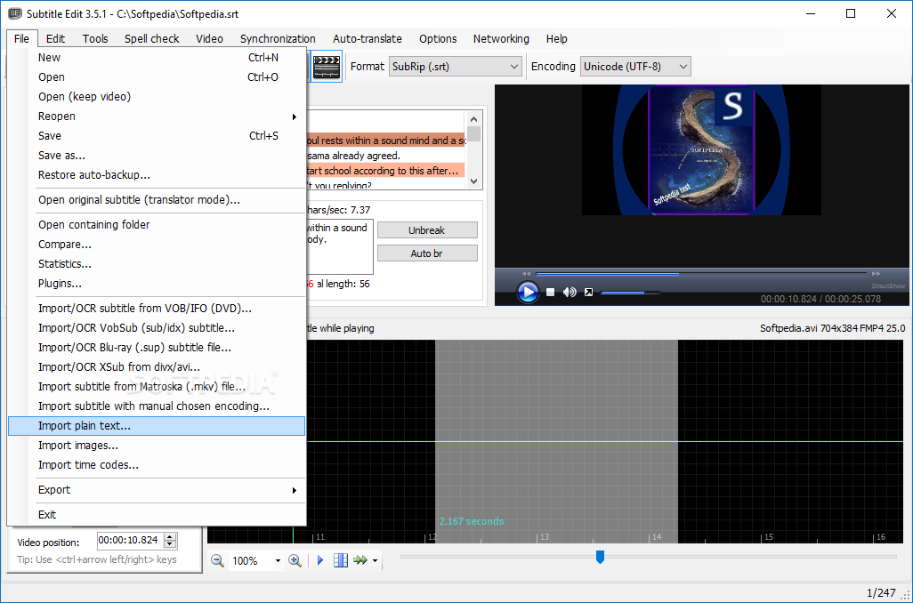 Subtitle Edit Portable is an editor for movie subtitles. With Subtitle Edit you can easily adjust the start time of any subtitle if it is not synchronized with the movie. The features are it converts between SubRib, MicroDVD, Substation Alpha, SAMI, and youtube sbv, cool audio visualizer control - can display wave form and/or spectrogram, import and OCR VobSub sub or idx binary subtitles, and can open subtitles embedded inside mp4 or mv4 files.
