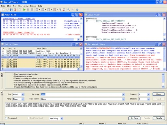 SUDT SerialTrace is a professional tool to monitor serial port information. It monitors, displays, logs, and analyzes all serial port activity in a system. SerialTrace delivers maximum functionality for everyone who needs real power to deal with ports. It features real-time data capture, data transmission and logging, support SerialRelay, could capture data between device and device, various monitoring visualizes, multi-colored mark, intercept and record all serial input/output control codes, emulate data sending on behalf of monitored application via unique internal terminal module, and sessions management.
