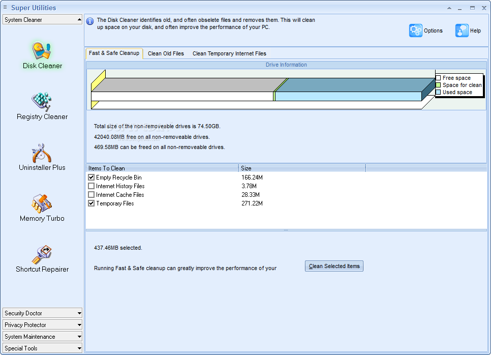 Disk Cleaner: Find and remove debris that has been left behind on your system by untidy programs, system freezes and sudden system restarts.