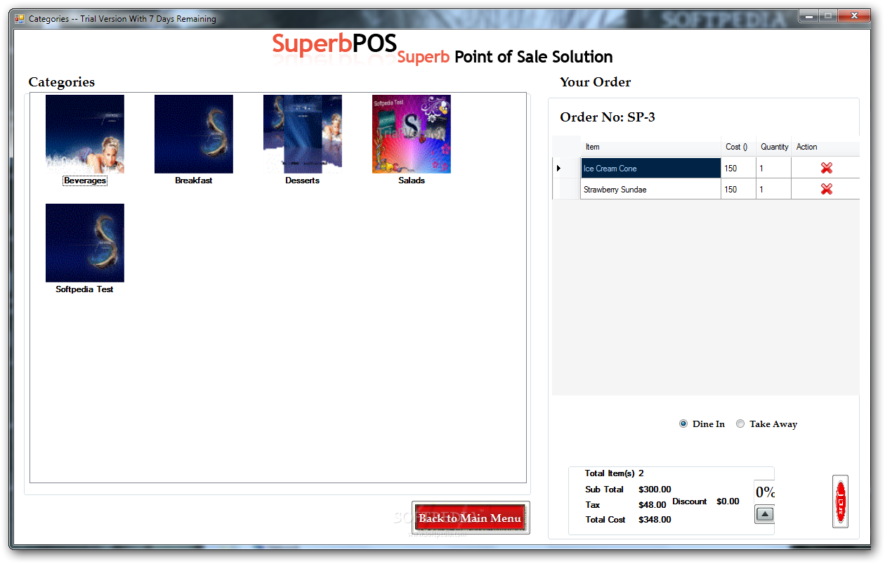 With the help of Superb Point of Sale you have the possibility to customize your own products, categories, deals and prices. Also, the application supports multiple currencies and enables you to personalize the generated reports and orders according to your preferences.Limitations in the unregistered version7 days trial period