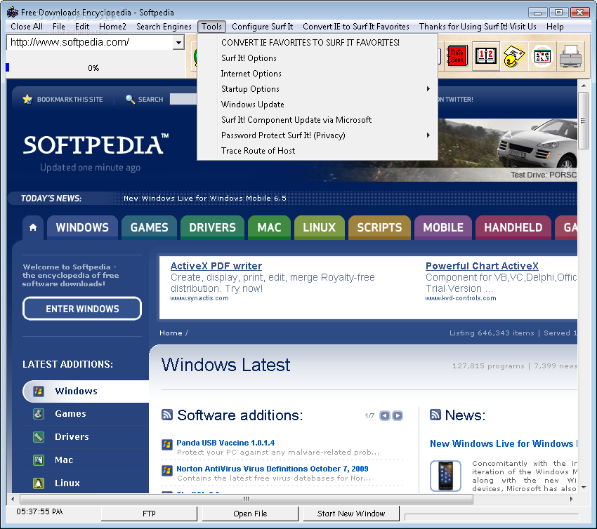 Surf It! is a sophisticated and user-friendly application that comes packed not only with a simple web browser but also with a notepad, calendar, and option to send anonymous emails. It can also sync the built-in clock via Internet, user timed shutdown, bookmark and gets rid of almost all popups, temporary internet files, cookies and URL history.