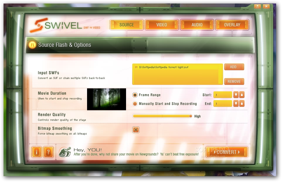 Swivel features render quality control options and bitmap smoothing, while also enabling you to customize the bitrate and select the video codec that will be used during the encoding operation. It enables you to customize the video size, which directly affects its quality. Input Flash files can be resized or cropped to fit the set dimension.