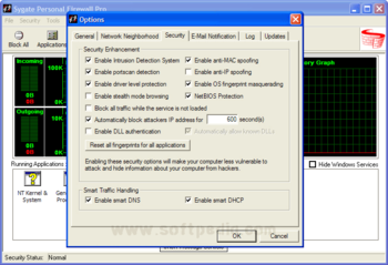 Plus, you can set advanced rules, perform a security test, block Network Neighborhood traffic while the computer is in screensaver mode, password-protect the firewall, select the network interface, configure "Smart Traffic" handling, as well as enable stealth mode browsing, DLL authentication, email notifications, and more.