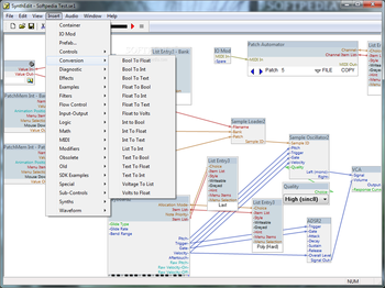 Pressing the right mouse button brings up a context menu, which is the quickest way to insert components. A staggering amount of controls, effects, filters, flow control, math, waveform and more are at your fingertips and each category holding even more elements.