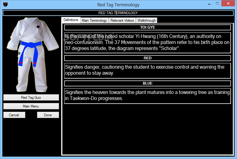 The software explains each level, offering training hall rules, the student oath, terminology, describing the stances, numbers, commands and several significant words. Each belt comes with a set of pattern exercises, called Sogi, that become more and more advanced. The software displays a 2D scheme of the specific Sogi and includes external URLs leading to explanatory YouTube videos.