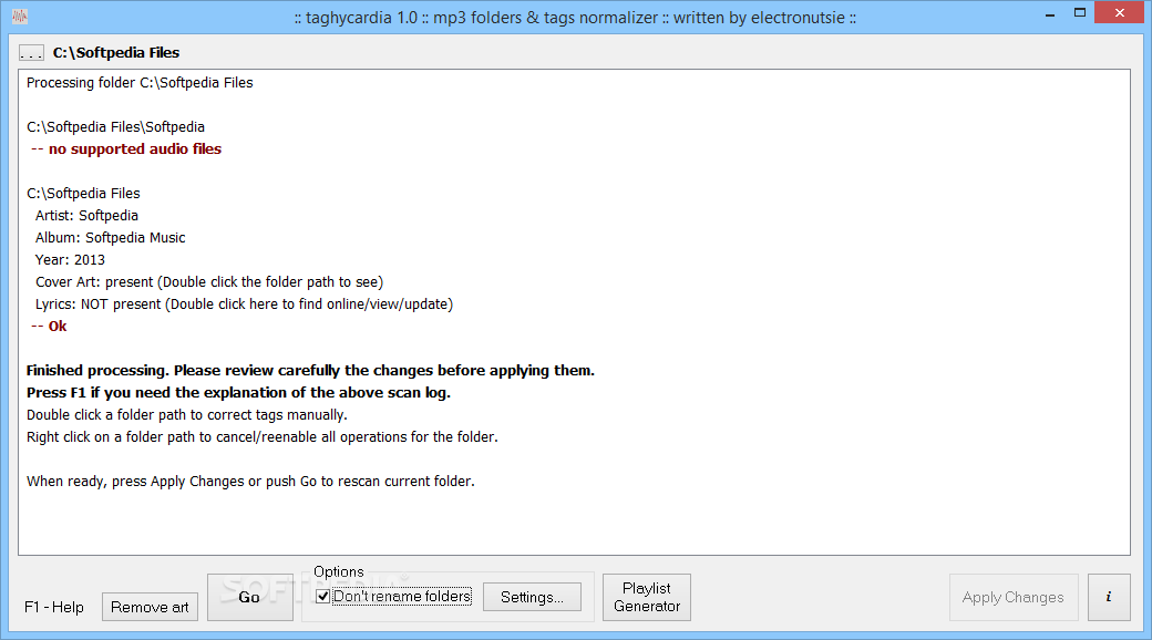 In the next stage it is necessary to drop a folder filled with MP3 tracks in the main window. There are many kinds of settings which can be tweaked. For example, it is possible to rename playlists, add track numbers to the file names if they don't already exist, as well as integrate taghycardia into the Windows Explorer context menu to quickly process files.