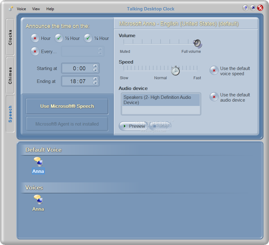 It uses Microsoft Speech or Microsoft Agent to announce the time on the hour, ½ hour, or ¼ hour.