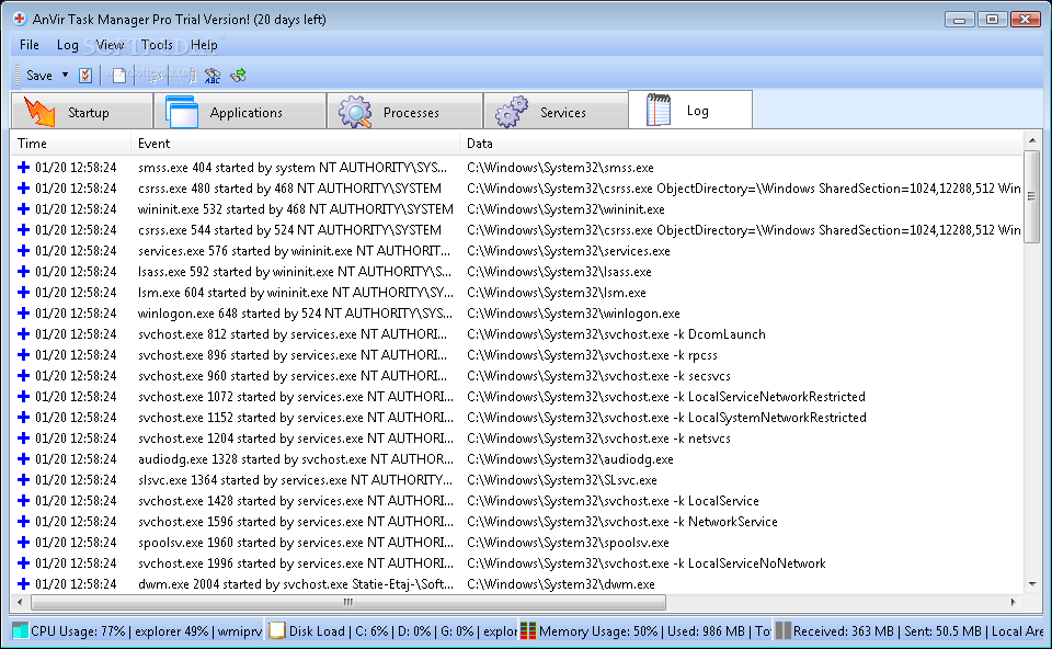 Get full information about all processes: CPU and memory usage, executable name with full path, priority, work time, user name.