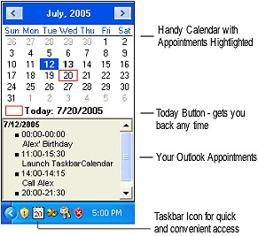 Pocket Calendar with Outlook integration. Accessible via the taskbar/system tray and keyboard shortcut. Shows appointments from Outlook in a small window with a single click or keystroke. Provides fast access to Outlooks appointments.