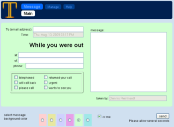 Take telephone messages electronically and deliver via e-mail. Fast and accurate with message taker and time of call recorded automatically. 6 colors and costs less than a pad of physical message slips. Pays for itself in 3 months at 10 messages per day. Solves inconsistent phone answer handling, phone message routing, handling of out of office calls, and lost while you were out message slips.