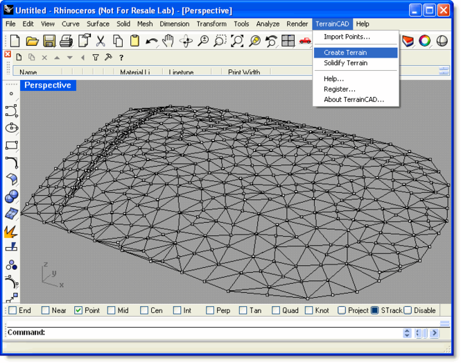 TerrainCAD for Rhino is a terrain modeling plug-in for Rhinoceros® 3.0 and 4.0. This plug-in gives Rhino the ability to create a terrain mesh from a set of unordered points, lines and polylines. The terrain mesh is created as a Delaunay Triangulation, which is regarded as the best method to create a terrain mesh from unorganized point data. TerrainCAD for Rhino is powered by TerrainLib, a state of the art terrain modeling library developed by SYCODE.