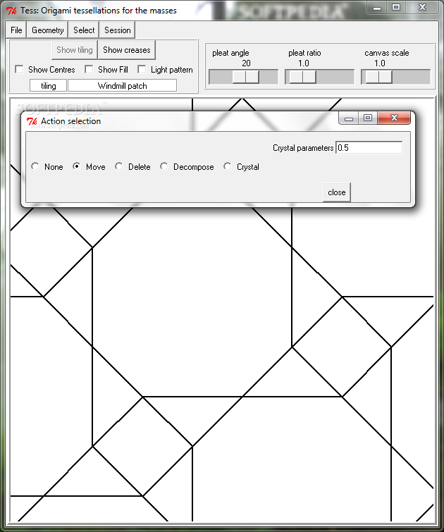 Users are allowed to create all sorts of standard tiles present in the drop-down menu under the 'Geometry' button. From there they can alter the pattern format in the 'Action' menu where they can choose whether the model must be moved, decomposed, deleted, or to make it take the shape of a crystal. Afterward, the users can manually click on the canvas model and the desired action takes place.