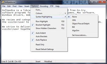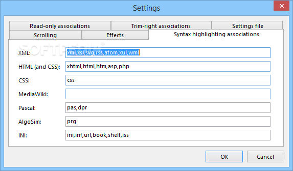 Syntax highlighting for XML, Object Pascal/Delphi, AlgoSim, and INI files (more to come).