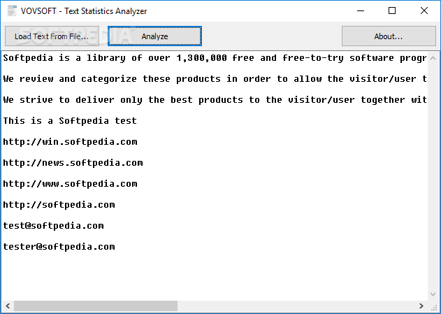 The GUI packs two main buttons, one allowing you to load your text from a file, with the other initiating the analysis itself. However, you can also simply paste your text in the main window, take a look at it and even make modifications if you consider them necessary.