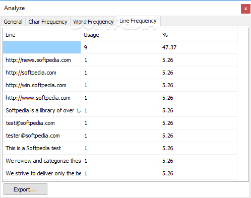 What’s more, character, word, and line frequency can be interpreted as well, with each item being associated with details regarding the number of instances it appeared in your text. Besides, the