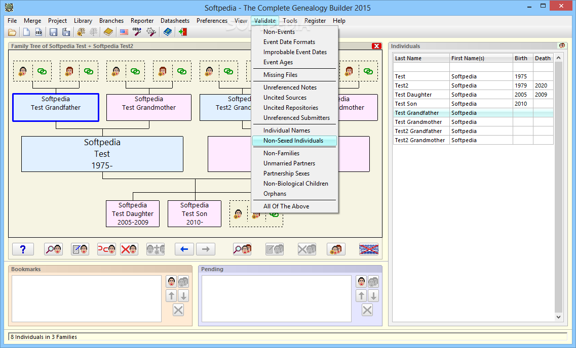 Features numerous validation tools. These include checking for non-standard date formats, improbable event dates, missing OBJE files, and individuals without a sex designation