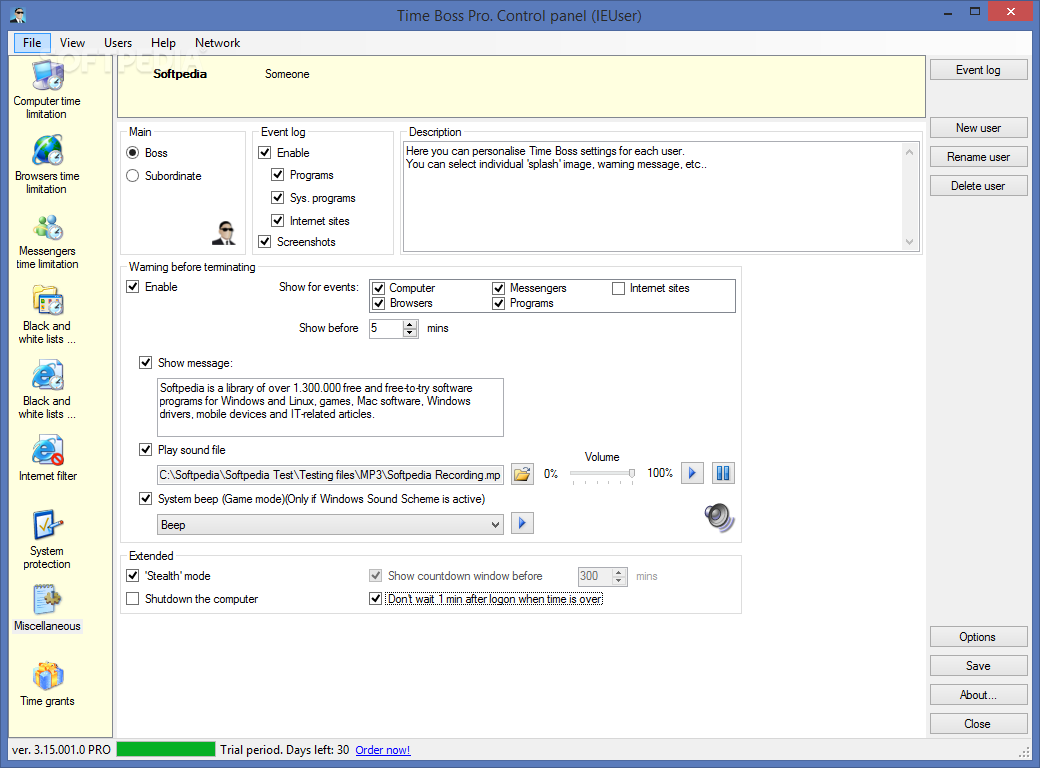 System administrators will benefit from its clear report system and such features as indication of remaining time, adjusting warning messages, allowed and forbidden software and many more. Considering its price and functionality, Time Boss PRO is an ideally balanced solution for home and business use.