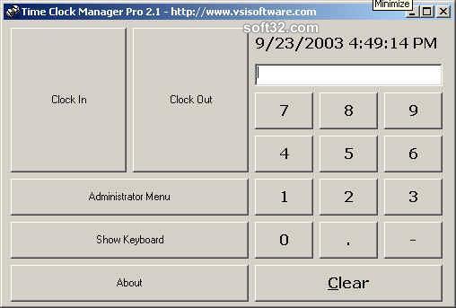 An employee time clock and a management tool. Its allows user to clock in/clock out. It works with touch screen monitors. Also has reports to show clocked in and clock out times. The application has integrated security and can work with networks or on stand alone computers. Its a very user friendly system, with this systems there is no more wasting paper with old fashion punch clock. There is also custom programming and customizing the application available. By - <a href="http://www.vsisystems . com / timeclockmanagerpro . htm " > TimeClock Software</a>