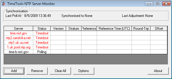 Reference servers that have timedout or are unsynchronised are highlighted. Additionally, servers that have not synchronised for an extended period of time or have a high stratum can also be highlighted.