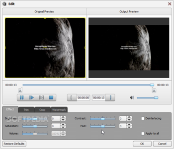 Adjust the video brightness, saturation and contrast. Even you can convert an interlaced video effect through the function of "Deinterlacing"