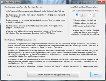 Set clock to shut your computer down at specified time. Set alerts in many different ways. Run any application at a specified time and date. Includes desktop clock with adjustable settings to see the same information on your desktop when all windows are minimized just like it does on the title bar. Speaks the time each quarter hour, half hour or top of each hour in a male or female voice. Change the title bar text color and font style in Windows Color and Appearance settings.