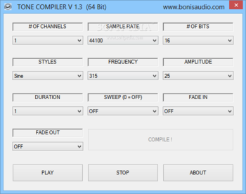 TONE COMPILER is a free software by Bonis Audio and works on Windows 10, Windows 8.1, Windows 8, Windows 7, Windows XP, Windows 2000, Windows 2003, Windows 2008, Windows Vista, Windows 2012.