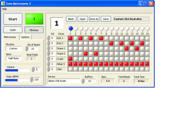 Tone Metronome is a flexible beat indicator that offers a variety of kick, snare, crash, hihat and click drums. The volume and timing of each drum can be setup independently to create a variety of drum rhythms. The program offers standard preset 2/4, 3/4, 4/4, and 2/3 drum patterns. A custom drum pattern can also be setup and drum patterns created by the user can be saved. A tempo up to 240 beats per minute is available. Drum pattern timing is displayed by means of a rhythm and beat indicator. The program supports 16 Bit Rate and is compatible with Windows 2000/XP.