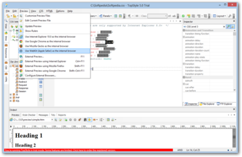 Full Screen Preview: Split the preview between Internet Explorer and Mozilla for an immediate look at browser differences. You can even change the !DOCTYPE of each preview panel on-the-fly to see how different document type declarations affect your layout.