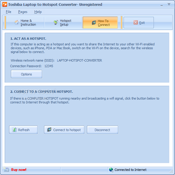 Toshiba Laptop to Hotspot Converter is a demo software by DGTSoft and works on Windows 10, Windows 8.1, Windows 8, Windows 7, Windows XP, Windows 2000, Windows 2003, Windows 2008, Windows Vista, Windows 2012.